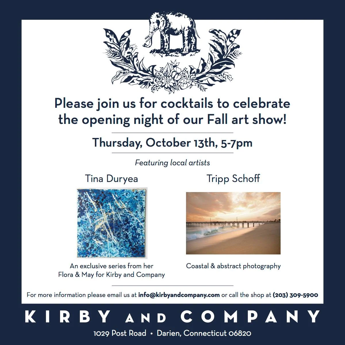 Join us for our Fall Art show opening party! We are welcoming two talented local Artists in the shop: Tina Duryea who has created an exclusive grouping for us from her Flora & May collection and Tripp Schoff with his coastal and abstract large scale photographs. Both artists will be on site to meet and greet and chat about their inspiration for their latest works. This show will run thru November 15th.