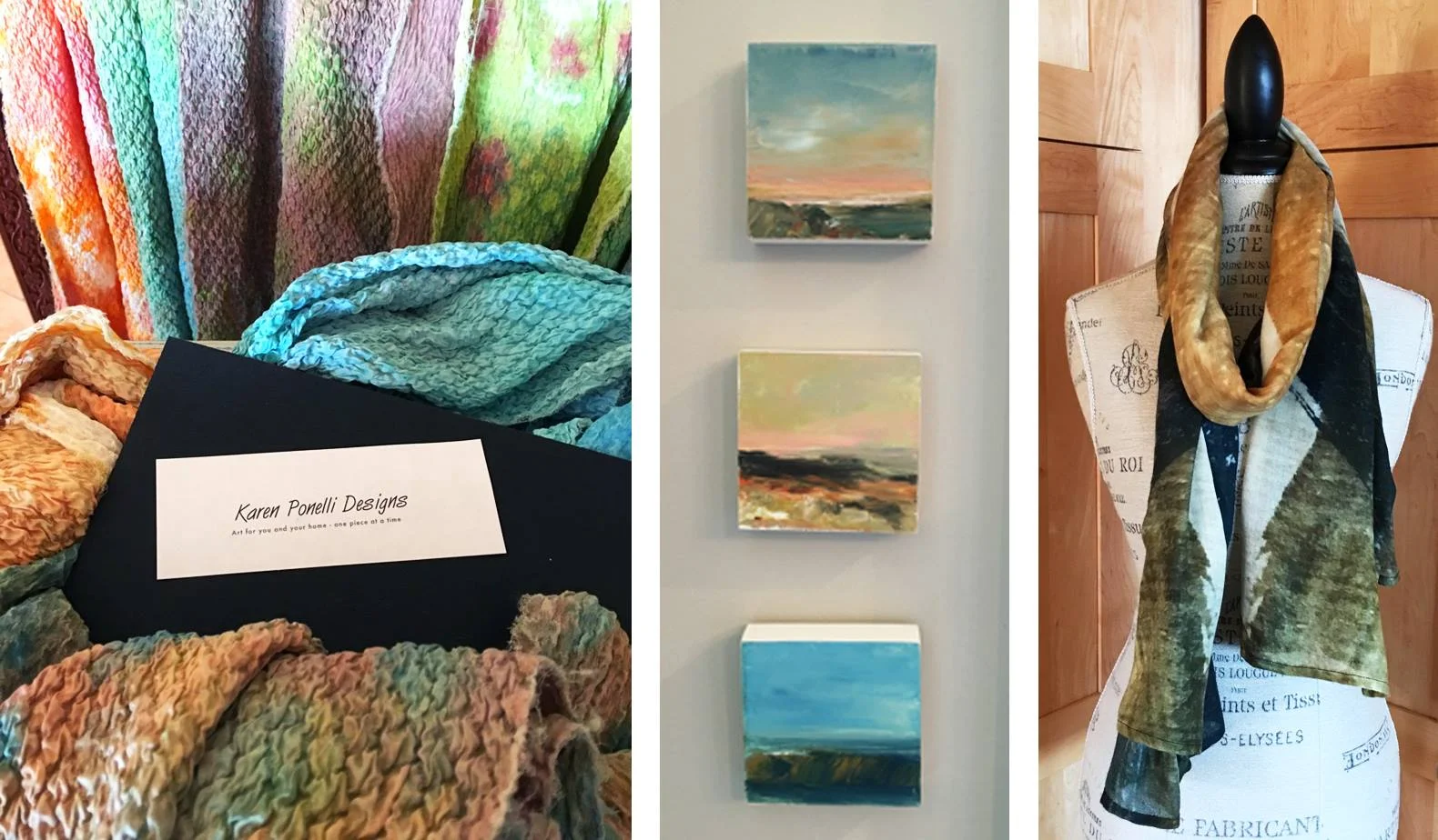 Local artist/designer Karen Ponelli will discuss how her contemporary arttechniques are transformed into scarves and accessories. She will be selling unique silk and textured scarves from her new line of contemporary artwork. Some of her scarves were created by a California based company using the artists’ paintings and designs to produce wearable products. In addition, Ponelli will have her one of kind scarves available that she creates from start to finish, which includes selecting and hand-dyeing the fabrics. Shop her hand-dyed silk flower accessory pins, framed and matted artwork, hand painted gift wrap and stationary as well as other unique, artful items great for gift giving.