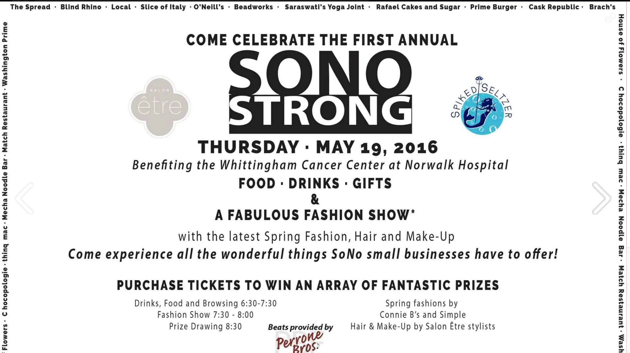 As a showcase for the many different businesses in SoNo, “SoNo Strong” will feature food, drinks and gifts, plus a fabulous fashion show with the latest spring fashion, hair and make up.