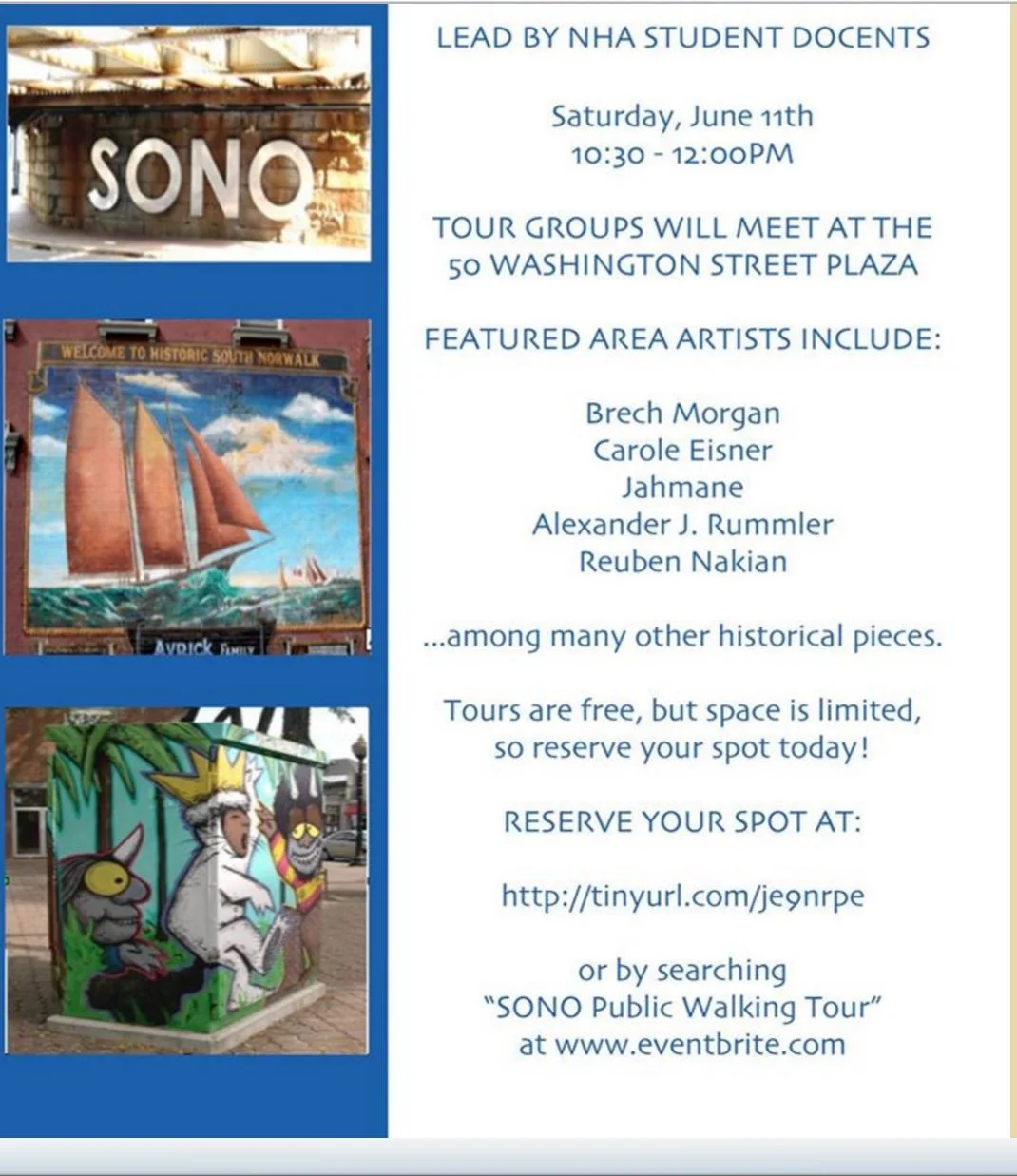 Take a tour of public art in South Norwalk, Connecticut. Student tour guides from the Norwalk Housing Authority 20 West Learning Center art program will share information about the artists and the art, including a few hidden secrets! Visit New Deal art at the post office and the library, murals from the 1980's, and more. The tour starts and ends on the plaza in front of 50 Washington St. Public parking is available nearby at the Maritime Garage, Haviland and Webster lots http://www.norwalkpark.org/map The tour is free but space is limited with advance registration is required.