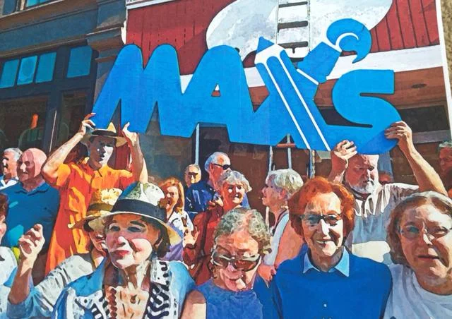 A new exhibit at Westport Historical Society, “Art to the Max”, opens on Friday, October 7 and will feature original art that graced Max’s windows from 1975-2014, including hand-drawn calendars by Nina Royce. Curated by Nina Bentley and Miggs Burroughs, it will include a recreation of Shirley Mellor’s “back office” decorated with cards and original art gifted to her by various local artists. Shirley was Max’s wife. “We played a huge role in the art life of Westport,” Shirley says proudly. “All the artists knew us. And they were a sizable number.”