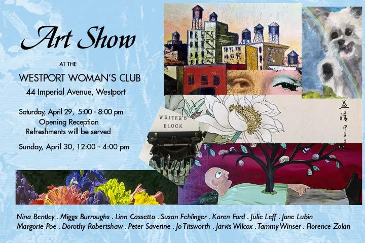 Its that time of year again for the great Woman's Club Art Show opening this Saturday from 5 to 8pm at 44 Imperial Avenue, Westport. The wonderful artists include Nina Bentley, Karen Ford, Linn Cassetta, Susan Fehlinger, Julie Leff, Jane Lubin, Marjorie Poe, Dorothy Robertshaw, Peter Saverine, Jo Titsworth, Jarvis Wilcox, Tammy Winser, andFlorence Zolan. Food, wine, and cheese cubes the size of cinder blocks! Proceeds go to their scholarship fund, and this years show is in honor of the late, great artist, Naiad Einsel.
