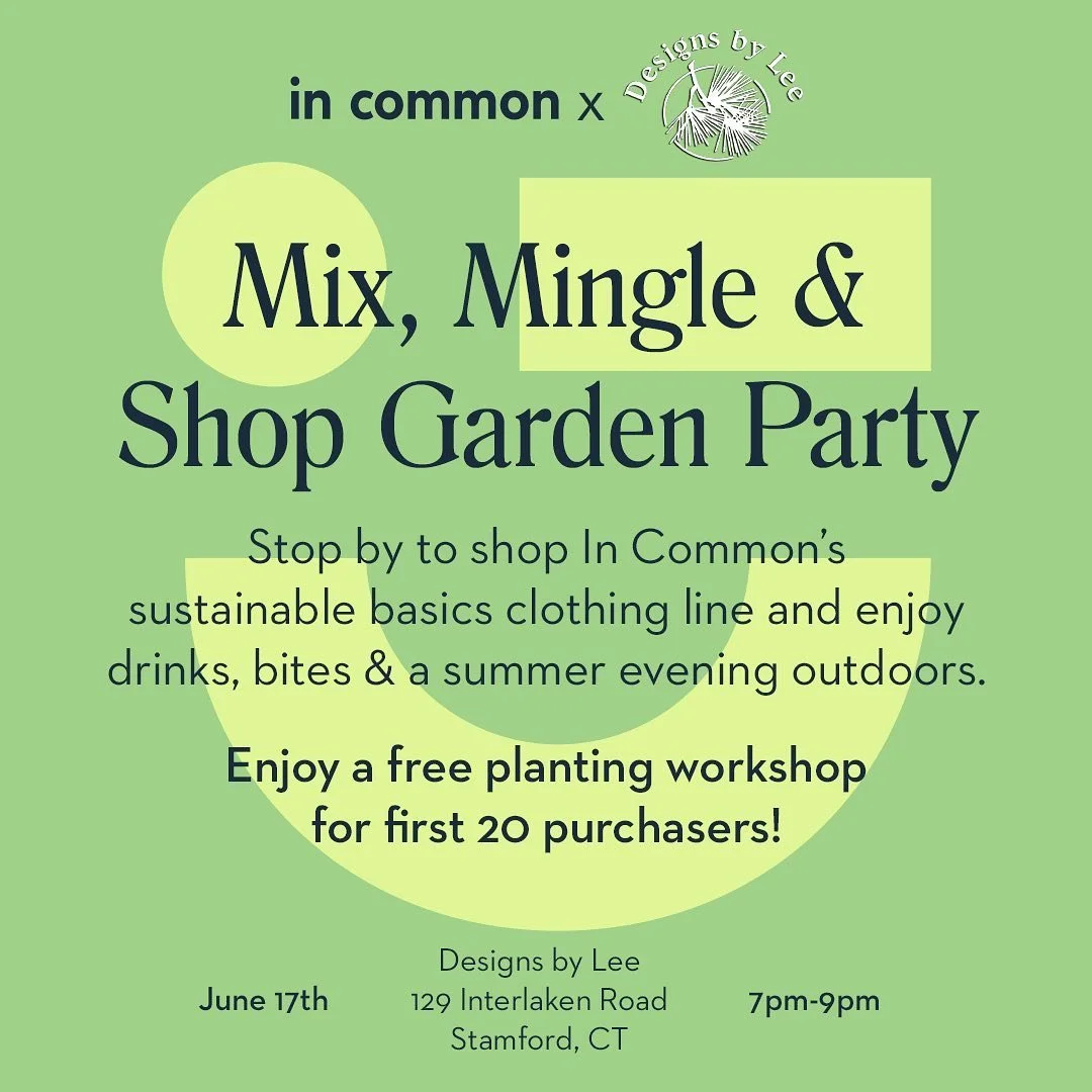 Come see and feel In Common's sustainable basics IRL, and shop with an exclusive discount! Enjoy drinks, snacks, and a beautiful evening in the Designs by Lee garden center.