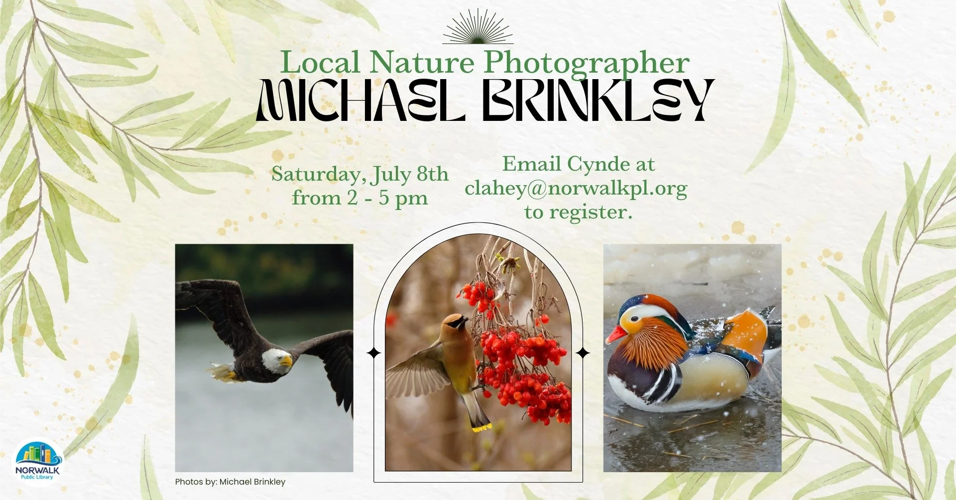 Join us for Local Nature Photographer, Michael Brinkley on Saturday, July 8th at 2pm at the Main Library. Please email Cynde at clahey@norwalkpl.org to register.