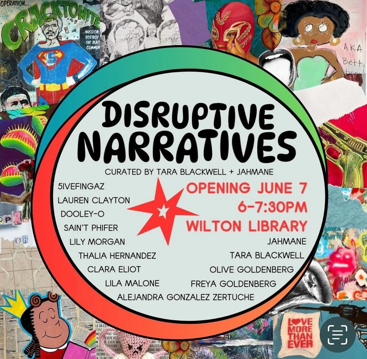 DON’T MISS THIS DOPE EXHIBIT!! OPENING EVENT JUNE 7th 6-7:30pm Wilton Library @wiltonlibrary_ct is pleased to present the works of area artists in “Disruptive Narratives,” opening on Friday, June 7 * The show’s curators, Tara Blackwell and Jahmane, are Connecticut-based artists known for their thought-provoking work that raises awareness of social issues. Together, they have curated a compelling exhibition featuring a diverse collection of talented artists who challenge the status quo. @artofjahmane@taramariebwell @lily.morgan.art@imale_z_art@dooleyo@studio162design@saintphifer@5ivefingaz @x.thalia There’s more! ® “Disruptive Narratives: Teen Edition” celebrates the transformative power of youth creativity, offering a platform for the bold and fearless expressions of a new generation of artists. @freya.goldenberg @olive_gives @lilamal_art and Clara Eliot